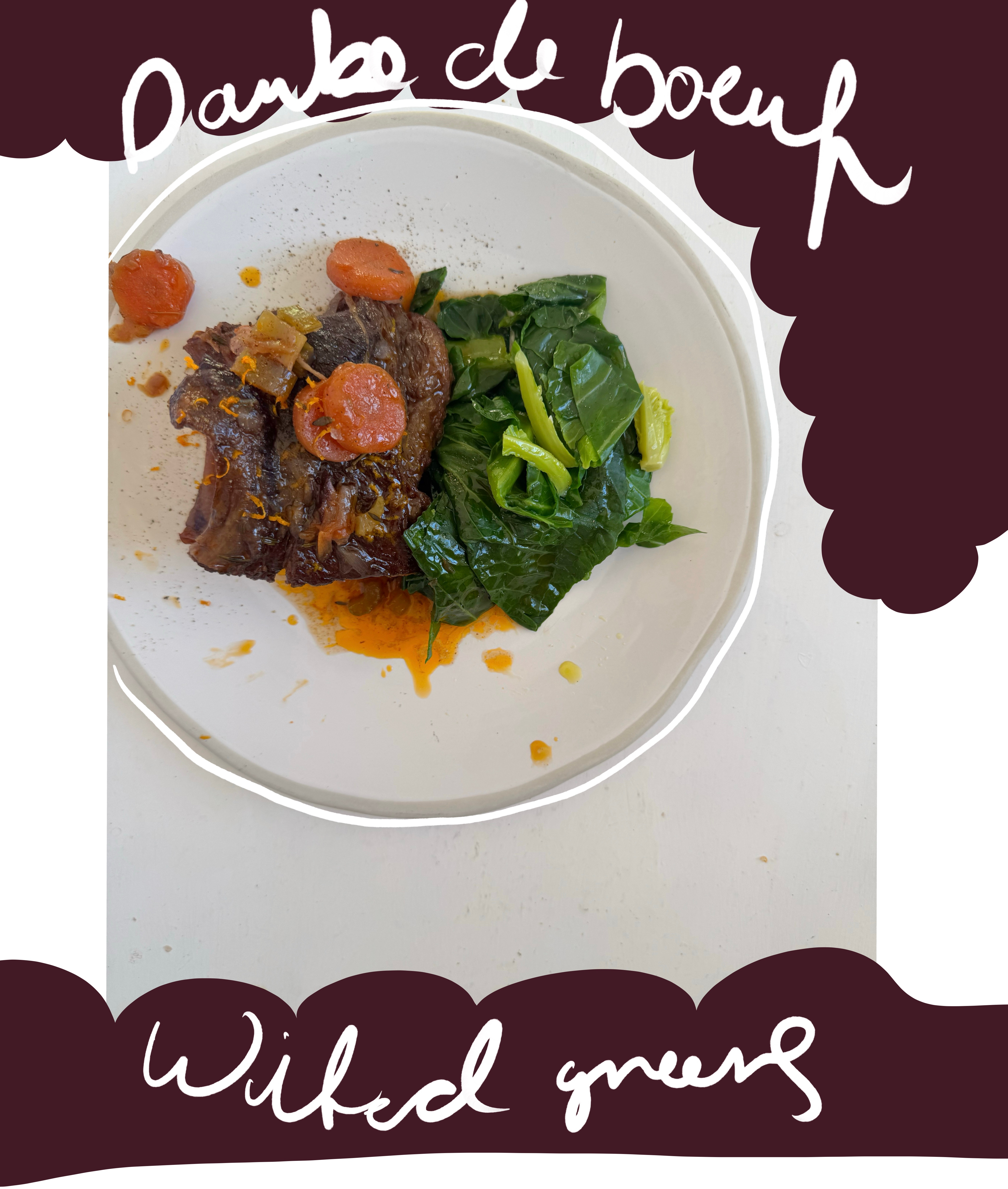 This is winter Provence in its purest form. You can actually catch this rich beef stew all year round in restaurants and they often serve it with spaghetti. A real nod to the Italian influence in the South of France. I love the orange notes for the flavour but, the rind also colours the sauce beautifully. This is rich and hearty. I have used short ribs here which makes it easy for portioning later on but, you can also use beef shin. Don’t be afraid of the anchovies, they melt away entirely and you don’t taste them. They add important depth to the stew. I would serve in shallow bowls with the greens and potatoes.